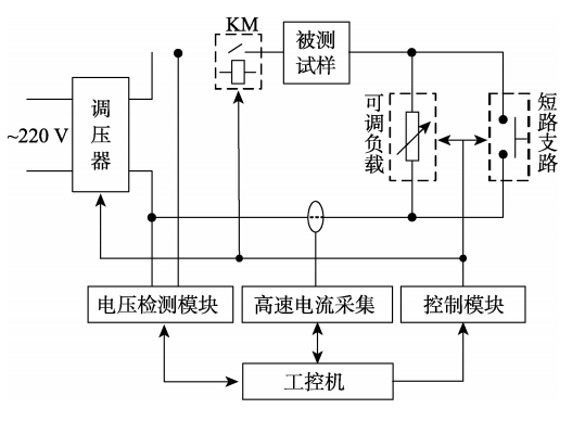 硬件设计主要包括工控机、供电单元、可调负载、高速电流采集模块、短路支路和电压检测模块的选择与设计。工控机选用研华公司的IPC-610L;可调负载型号为RXF-AC220V 1-64A交流负载,可调负载上安装有DC24V继电器,可通过控制继电器进行阻值切换;高速电流采集模块选用固纬MDO-2000E系列多功能混合域示波器,频率带宽200MHz,较大实时采样率可以达到1GSa/s。
