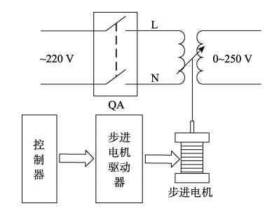 供电单元由调压器、步进电机和步进电机驱动器组成。所选用的调压器型号为TEGGC2J-30KVA,输入电压为单相220V,输出电压0~250V,输出额定工作电流为120 A;选用的步进电机驱动器型号为HST884A,采用直流24~50V供电。工控机可通过控制步进电机调节调压器的输出电压,避免了手动操作。