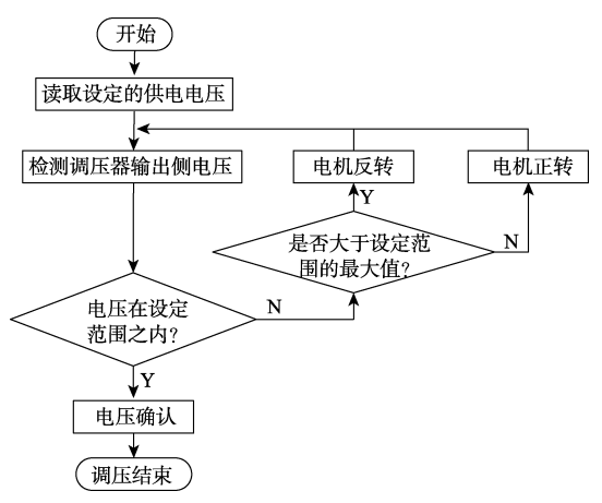 测试装置供电程序流程图如图7所示。在对电气防火限流保护器进行电压波动测试时,调压器输出侧需要提供187V和242V电压;在进行短路限流测试和过负荷保护测试时,调压器输出侧需要提供220V电压。在测试软件界面选定供电电压之后,软件通过电压检测模块实时读取调压器输出侧的电压有效值,并判断其是否在设定的电压范围之内,若在范围之内,则调压结束;反之,继续进行调整,判断其是否大于设定范围的较大值。若大于,则使步进电机反转,减小调压器输出侧电压;反之,使步进电机正转,增大调压器输出侧电压。重复上述操作,直至调压器输出侧电压调整到设定范围之内,保证供电电压的准确性。