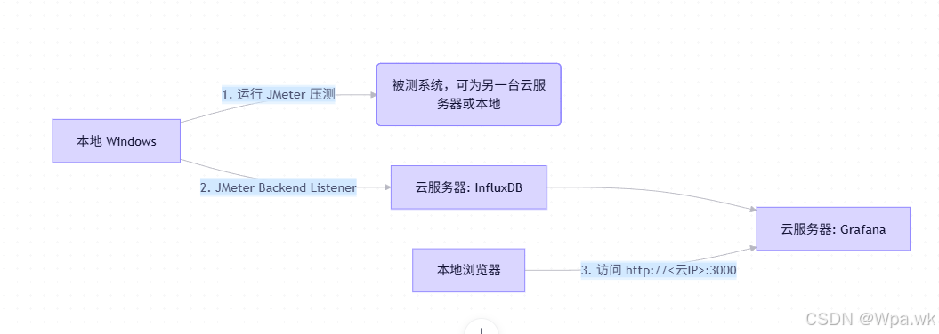 1. 逻辑图 - 在 Windows 环境 + 云服务器 上构建 JMeter + InfluxDB + Grafana 实时压测监控体系