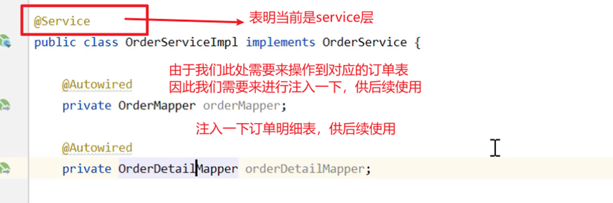 由于用户下单,我们需要来操作订单表和订单明细表à因此此处我们需要在service实现类其中来注入对应的mapper表信息来供后续的操作