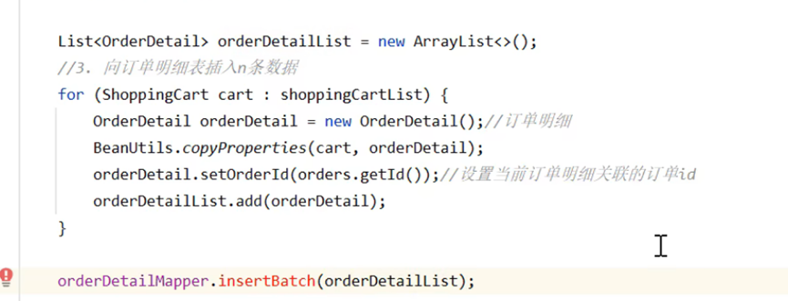 拿到购物车其中的数据内容,遍历其中数据封装到对应的订单明细表其中去