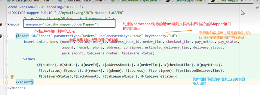 以及对应的values后面所对应的#{}占位符其中必须来对应的是Java实体类Orders其中的属性名