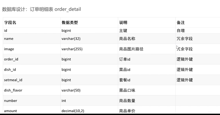 订单明细表(由于订单表和对应的订单明细表对应是一对多关系,因此对应的订单表其中一条数据对应的订单明细表其中可能对应多条数据)