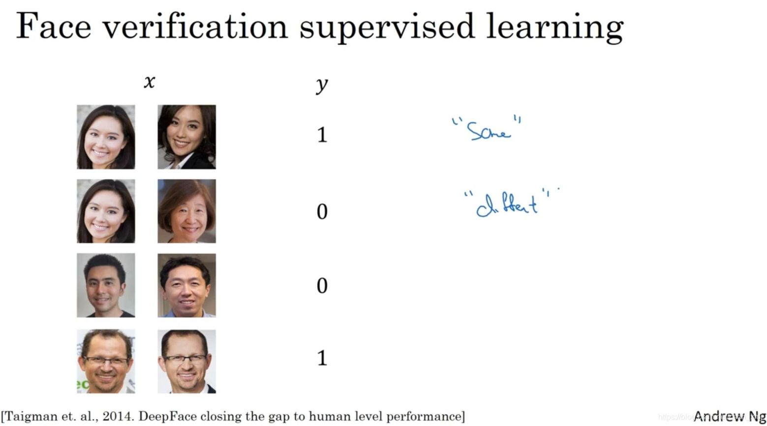 人脸验证:一张输入图片,以及某人的ID或者是名字,验证输入图片是否是这个人(一对一问题)
