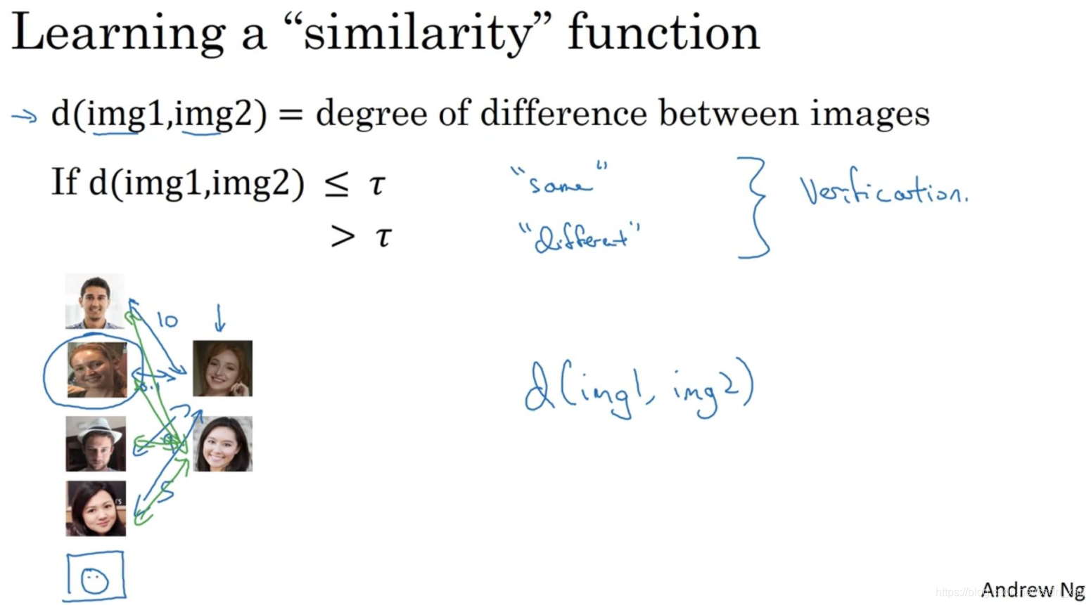 - 使用similarity函数:输入两张人脸图片,然后输出相似度。实现这个功能的一个方式就是用Siamese网络。