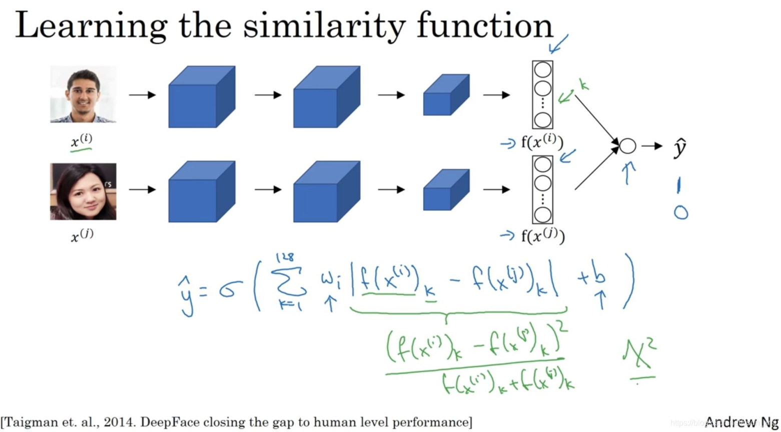 - 除了Triplet loss,将人脸识别当成一个二分类问题也是一个学习参数、训练网络的方法。