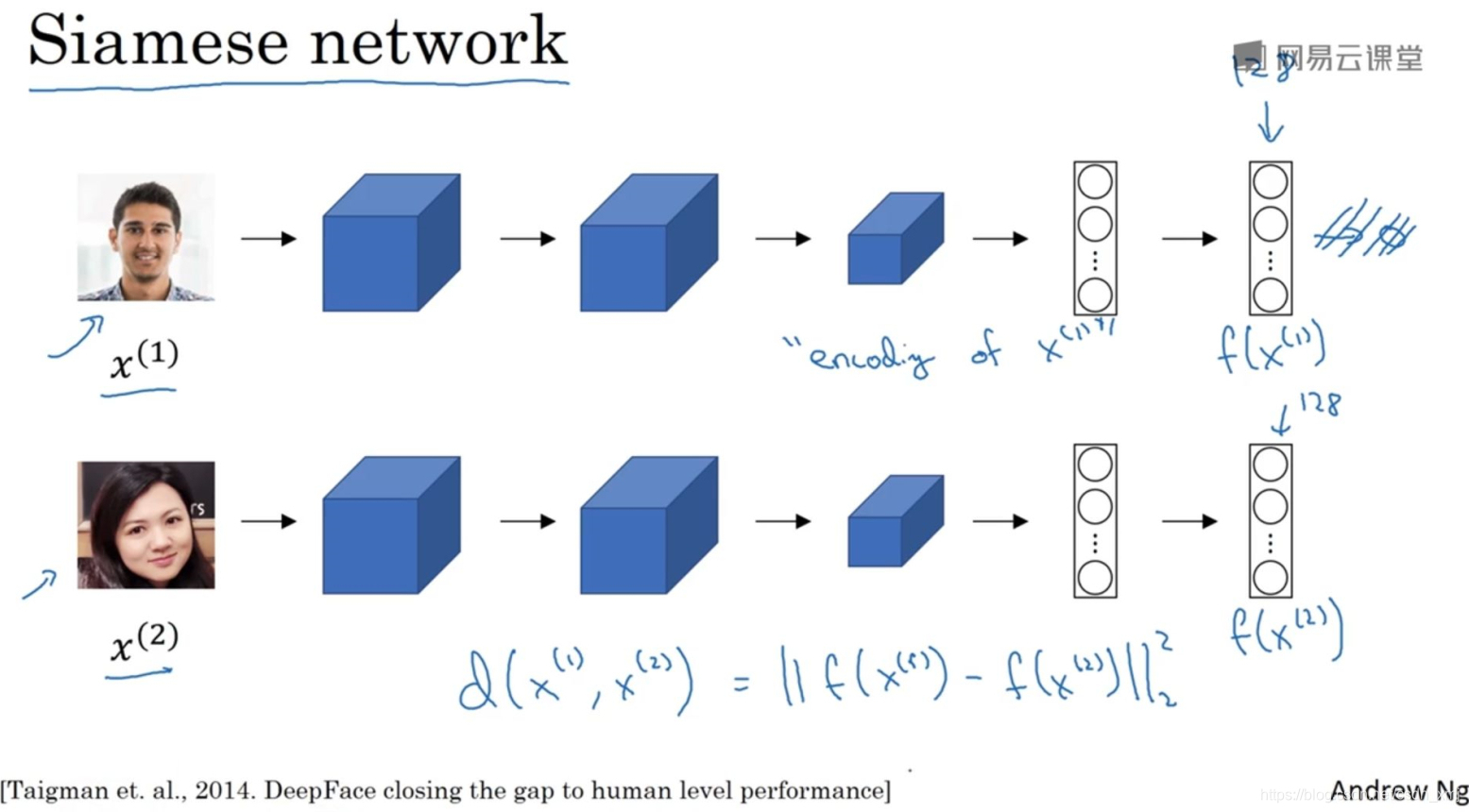 - 对于两个不同的输入,运行相同的卷积神经网络,然后比较它们,这一般叫做Siamese网络架构(Siamese neural network architecture)