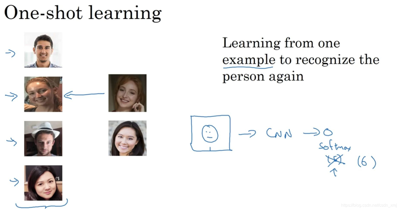 有一种办法是,将人的照片放进卷积神经网络中,使用softmax单元来输出5种,分别对应这4个人和都不是,但实际上这样效果并不好,因为如此小的训练集不足以去训练一个稳健的神经网络。