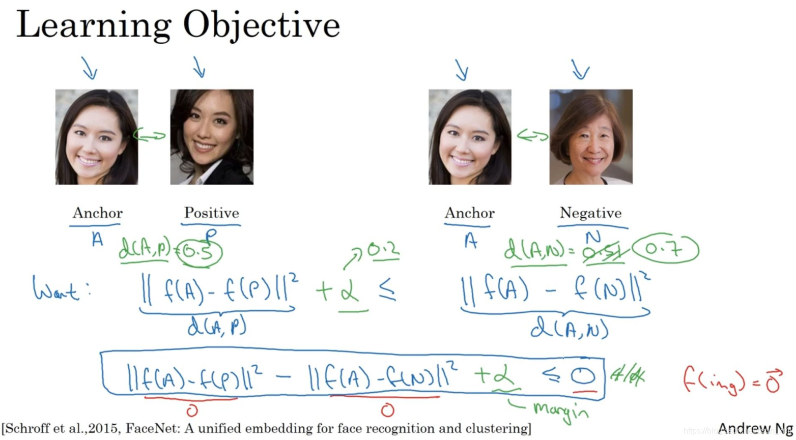 - 接下来定义d,将x(1)和x^(2)的距离定义为这两种图片编码之差的范数:d(x1,x2)=‖f(x1) - f(x2) ‖²