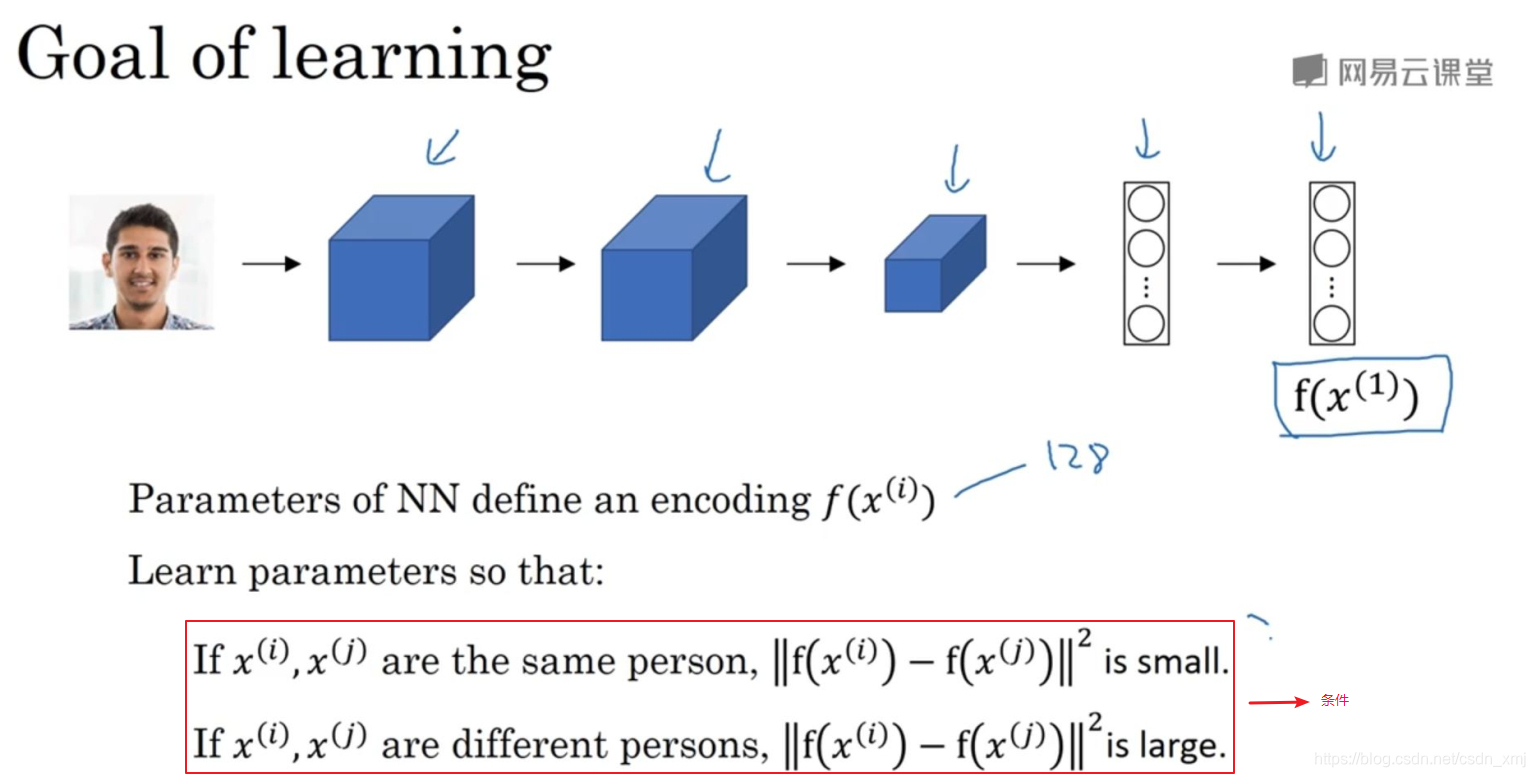 - 如果要比较两个图片的话,把第二张图片x(2)喂给有同样参数的神经网络,然后得到一个不同的128维向量。