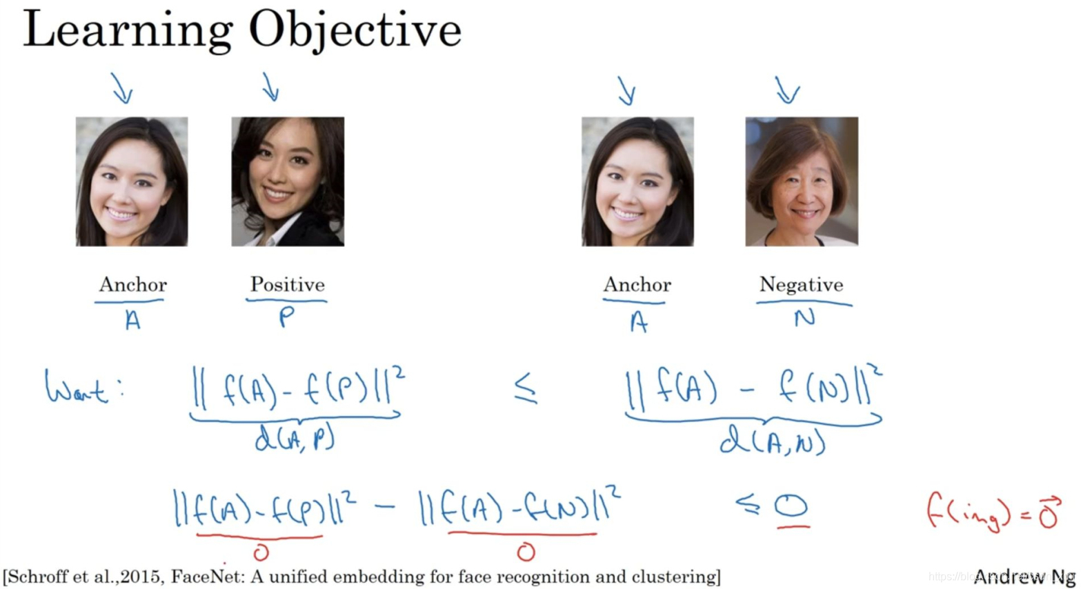 为了应用三元组损失函数,你需要比较成对的图像。通常是看三个图片,一个 Anchor 图片,Positive图片,Negetive图片,通常把它们简写成A、P、N。