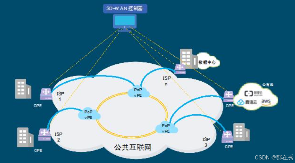 在本地分支机构部署 SD-WAN 的 CPE,云端部署 SD-WAN 控制器,CPE 之间利用互联网和 VPN 技术实现安全连接