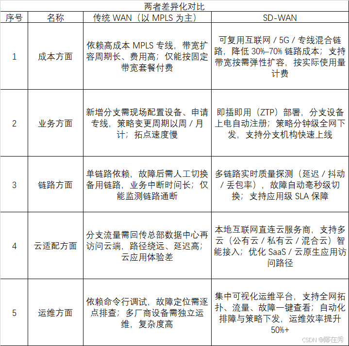 SD-WAN(软件定义广域网)具有多方面的优势,主要体现在以下几点: