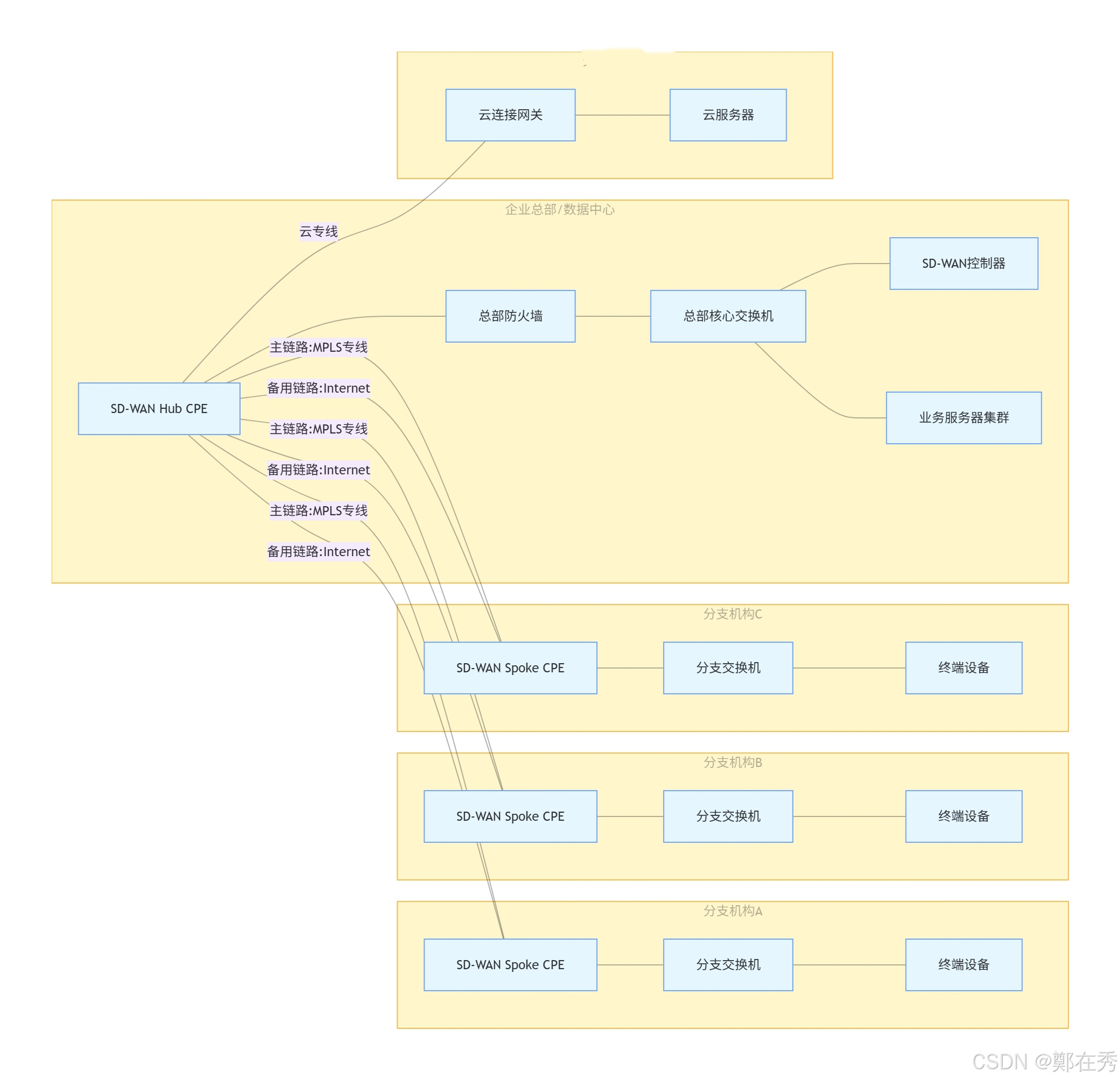 - 官方定义:SD-WAN是一种虚拟化广域网架构,核心是将网络控制平面与数据转发平面解耦,通过集中式软件控制器实现广域网连接、流量与策略的智能化管理,可整合 MPLS、互联网、4G/5G 等多种链路,适配云计算与分布式办公需求。