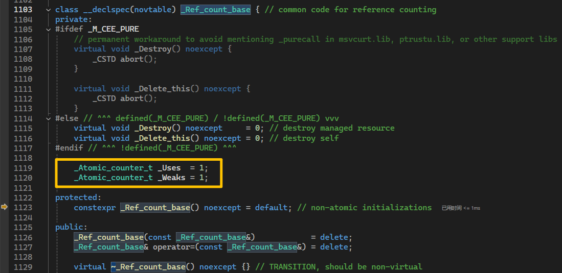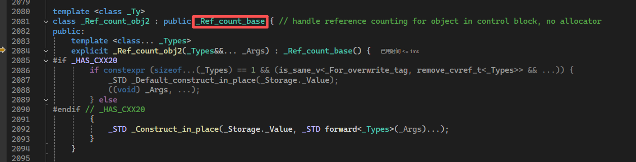 进入_Ref_count_obj2类,我们此时发现,_Ref_count_obj2集成了_Ref_count_base类。运行_Ref_count_obj2构造函数之前会去初始化各类构造函数,我们继续运行进入_Ref_count_base类中: