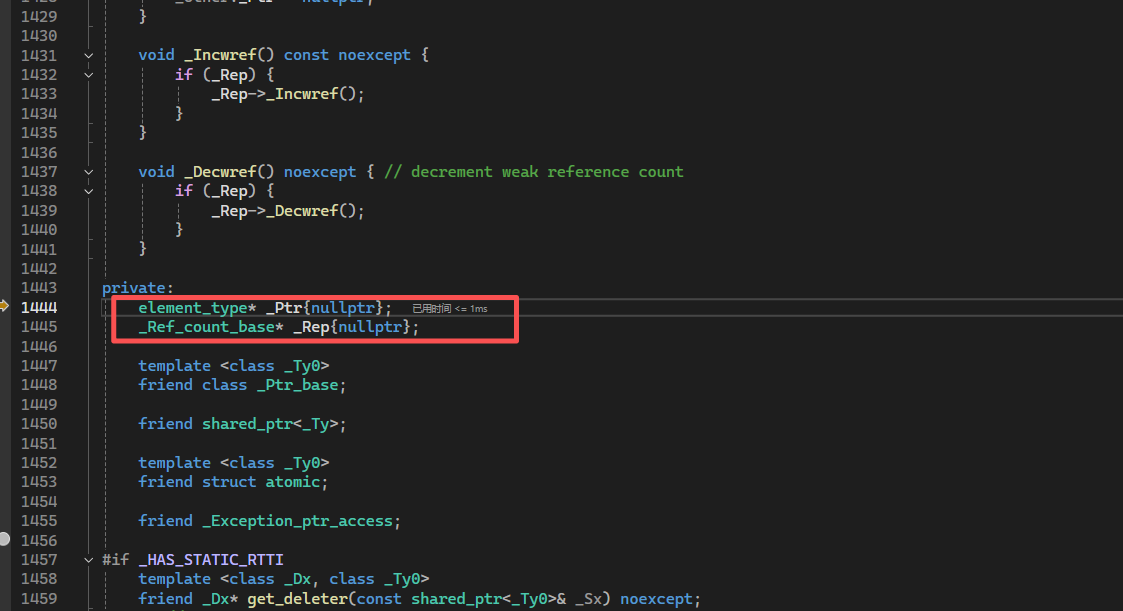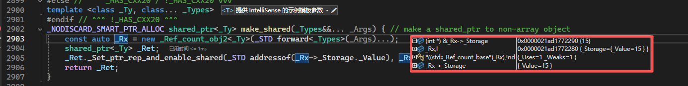此时可以发现类_Rx的地址为0x0000021ad1772280紧挨着0x0000021AD1772290,是在一块内存中。继续运行,进入shared_ptr类:
