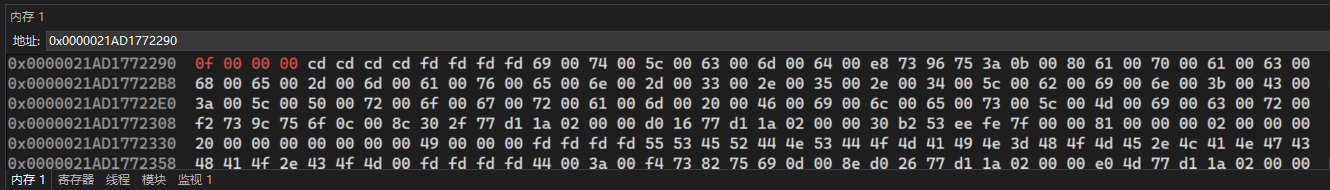 运行完"::new (static_cast<void*>(_STD addressof(_Obj))) _Ty(_STD forward<_Types>(_Args)...);"函数之后我们再看0x0000021AD1772290地址发现已经初始化了值,值为 0f =15 ,int类型4个字节。