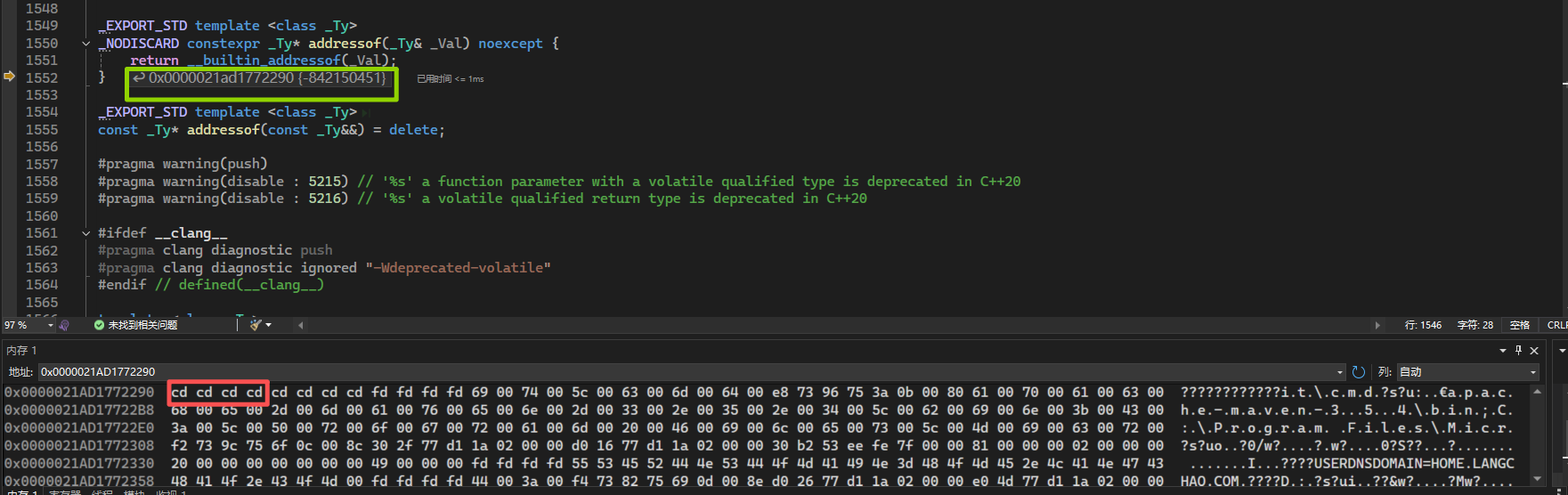 的确如此。我们可以看到,函数返回一个地址为0x0000021AD1772290,此时只是分配了地址,但并没有初始化内容(红色框中显示)。