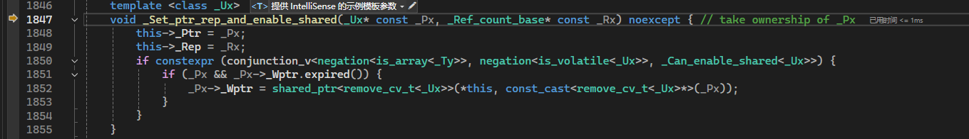 单步跳出,运行"_Ret._Set_ptr_rep_and_enable_shared(_STD addressof(_Rx->_Storage._Value), _Rx);"函数: