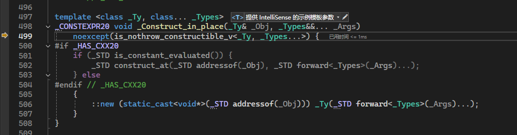 我们可以看到黄色框中醒目的两个变量:_Uses与 _Weaks,这便是强引用与弱引用。继续单步运行会发现_Uses与 _Weaks皆被初始化为1。退出_Ref_count_base类,继续运行_Ref_count_obj2的构造函数,进入"_STD _Construct_in_place(_Storage._Value, _STD forward<_Types>(_Args)...);":