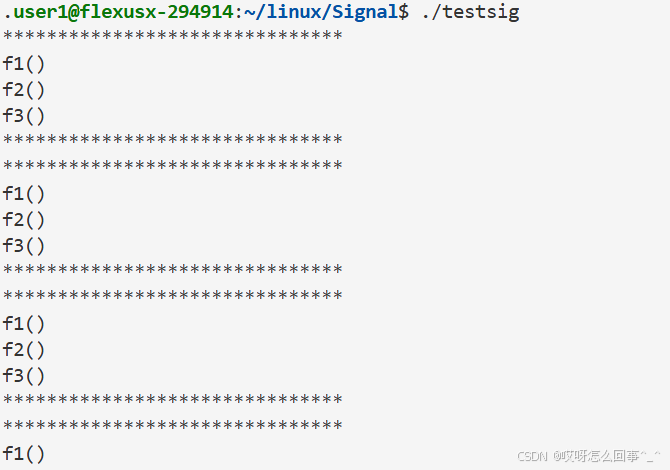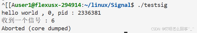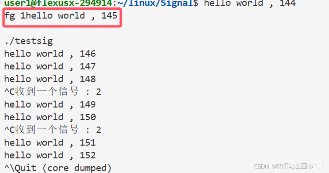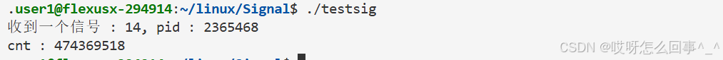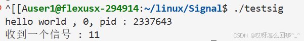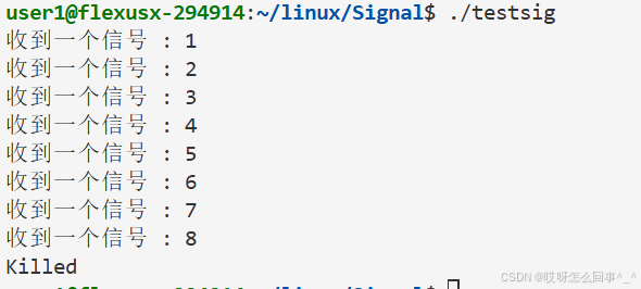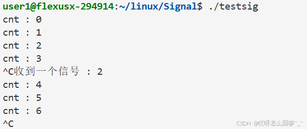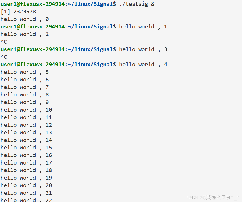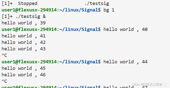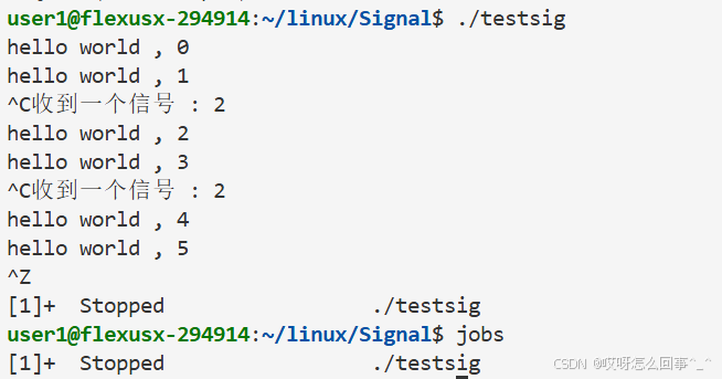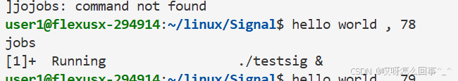还是上面的testsig.cc代码 当运行时 从键盘上输入信号 这个进程运行被影响 当运行时./testsig & 在运行命令后面加上一个& 再观察运行时从键盘上ctrl+c发送信号之后进程运行情况