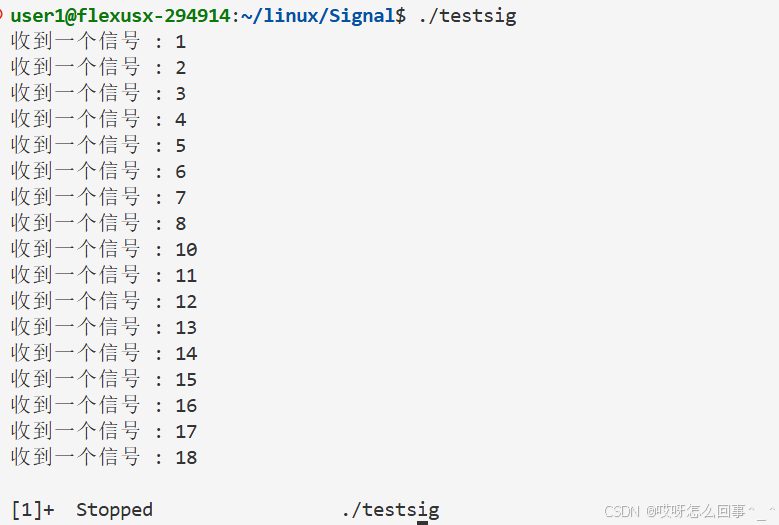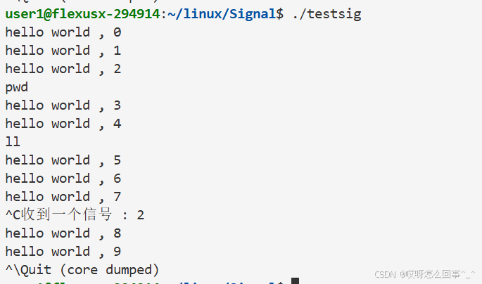 发现确实pwd ll这些命令没用了 这是因为前台进程只能有一个 当testsig变成前台之后 shell就是后台进程了 而后台进程接受不了从键盘输入的信号