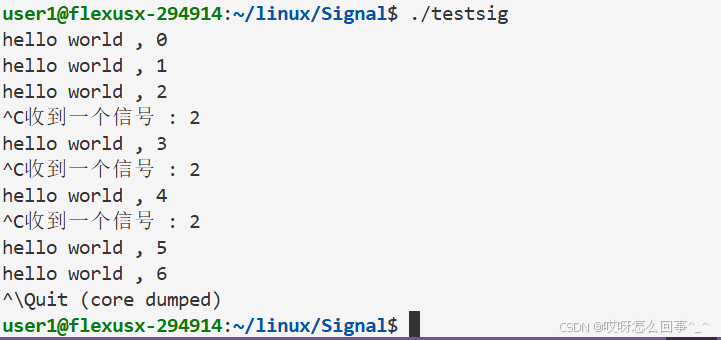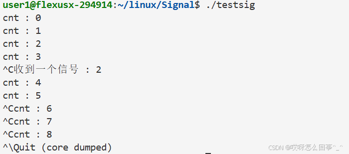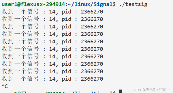 可以观察到现在ctrl+c杀不掉进程了 因为我们自定义了进程收到这个信号之后的处理 是打印 不是默认处理的终止 可以使用ctrl+\来终止进程 这也是一种信号