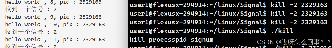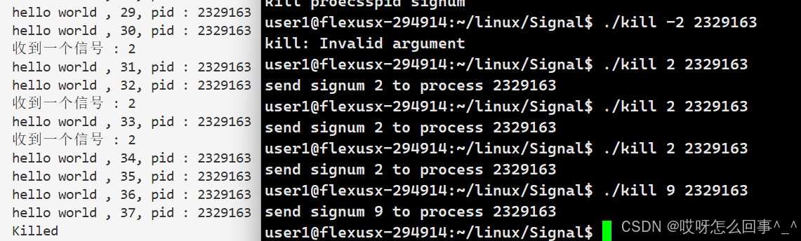 此时发现按ctrl+c没用了 这是因为加上&之后这个进程就变成了后台进程现在只能在另一个终端来杀掉这个进程kill -9 加进程号实际上这个命令也是向进程发送信号