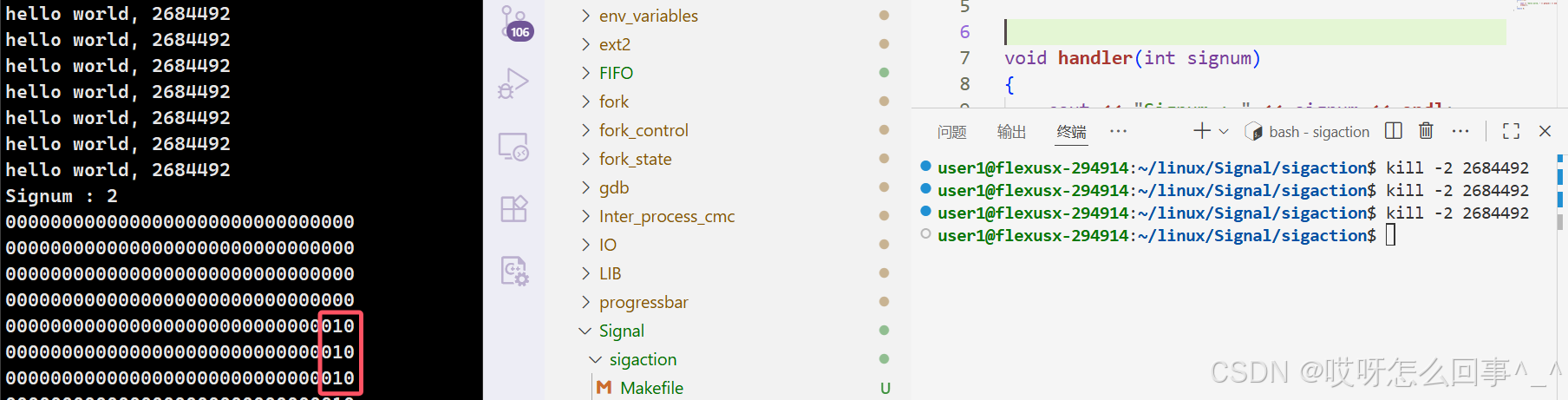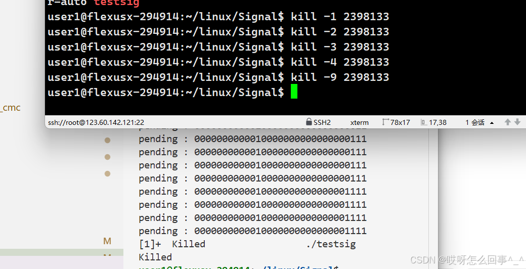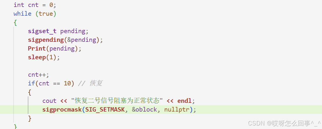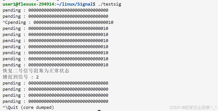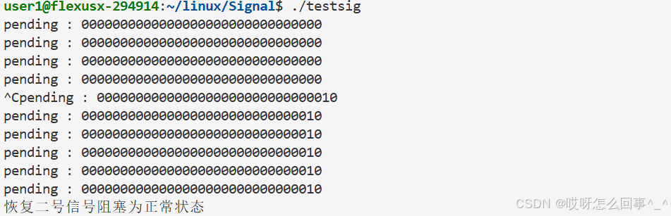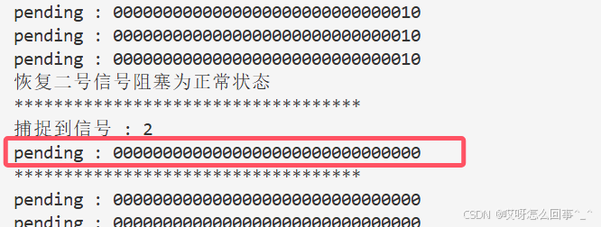 首先来使用这个接口 看是不是可以屏蔽 只需要在处理这个第一个接收的信号时一直打印pending表即可 若是第二次发送2号信号 那么pending表2号信号的位置一定是1