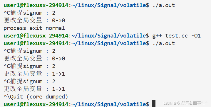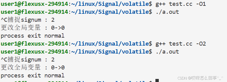 不做编译优化时 按照常规步骤来 也就是while一直检查CPU的工作就是一直访存检查flag 当发送二号信号之后 捕捉信号 修改flag的值 此时while再次检查 发现条件为假 进程正常退出