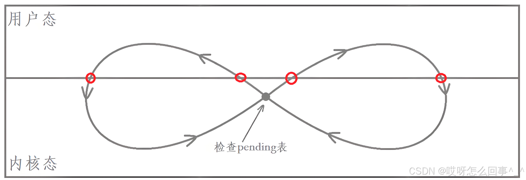 时候,因为硬件中断使进程切换到内核,再次回⽤⼾态之前检查到有信号待处理,于是切换 到