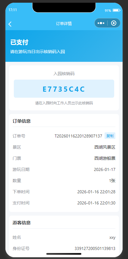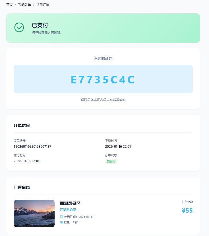 从业务价值看,系统实现"线上购票 + 线下核销"的闭环,可以显著提升旅游服务效率: