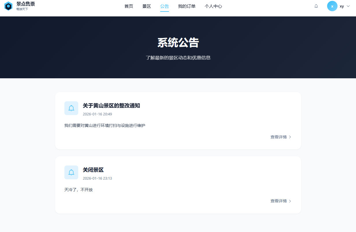 从平台运营角度看,公告模块的价值不仅在于信息发布本身,还在于形成"平台规则与用户沟通"的稳定渠道,例如节假日开放时间调整、景区临时限流、系统维护窗口等信息都可以通过公告触达用户;在论文表述中,公告模块能够体现系统并非单纯交易 CRUD,而是具备一定运营属性与服务属性,从而增强课题的现实意义。
