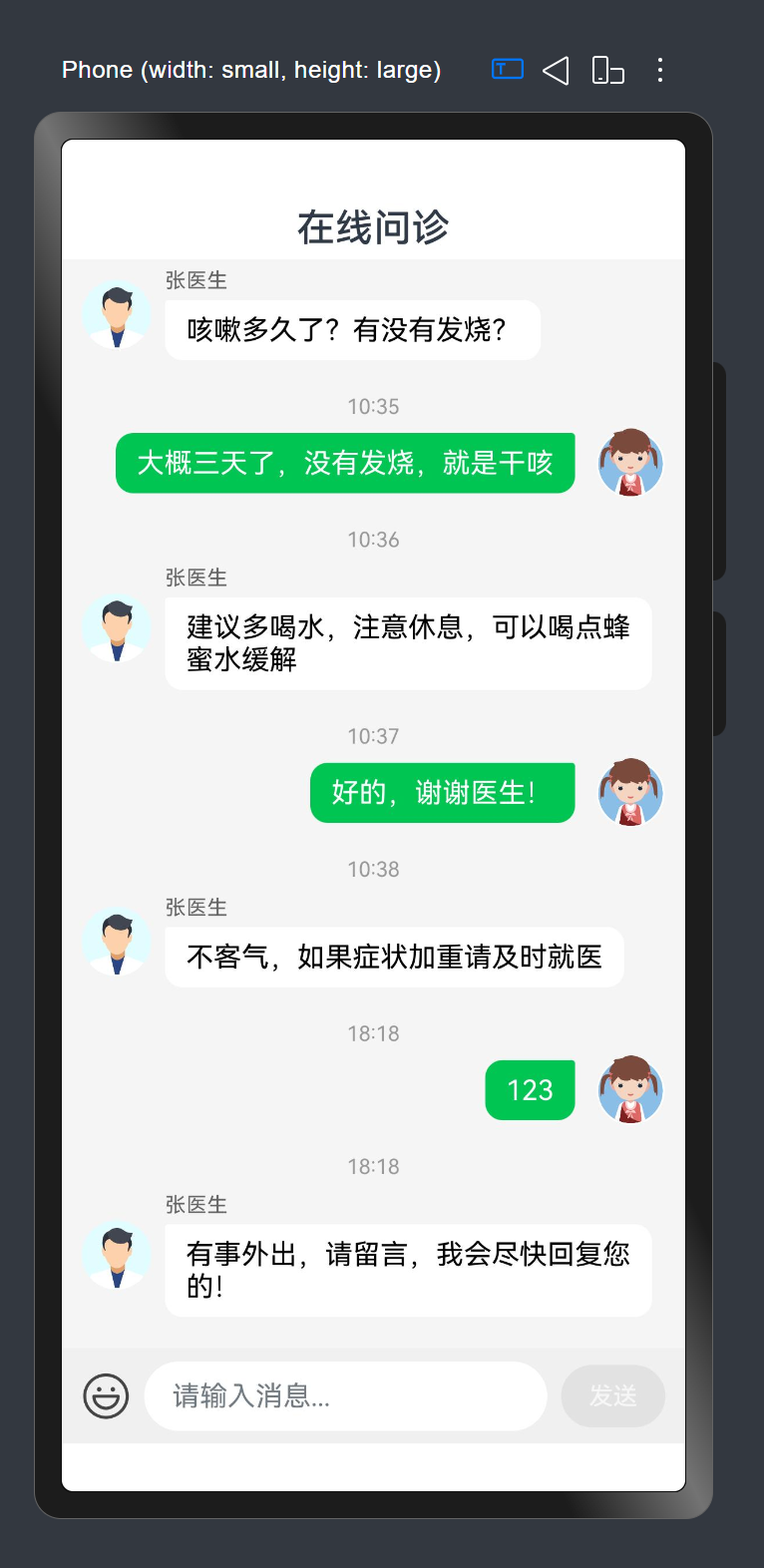 - 区分左右消息布局:用户消息居右显示(绿色气泡),医生消息居左显示(白色气泡)