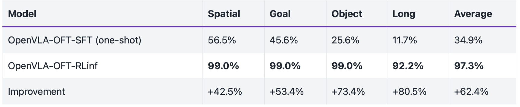 同时RLinf也支持多项来自一线从业者的刚需,包括LoRA训练,断点续训,以及适应不同网速用户的训练可视化(Tensorboard、W&B、SwanLab)等。此外,RLinf也正在集成SFT模块,致力于提供一站式的服务,通过一套代码满足多样化的训练需求。