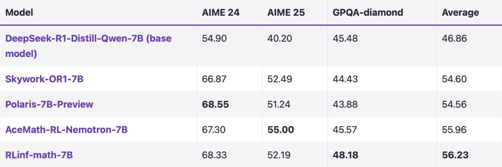 面向具身智能是RLinf 的应用特色,但RLinf的系统设计思想不仅限于具身智能,灵活、可扩展的设计理念使得其可以快速支持其他应用,体现了其通用性。以RLinf 支持的推理大模型训练为例,团队集成优化后的GRPO算法[2]进行了数学推理大模型的训练,数据集为AReal-boba数据集[3],基座模型为DeepSeek-R1-Distill-Qwen。在三个测试集(AIME24、AIME25、GPQA-diamond)中进行测评,32 个样本取平均,Pass@1测试结果如表2和3所示,RLinf-math-1.5B和RLinf-math-7B在三个测试集上均取得SOTA性能(注:表格中的模型均来自HuggingFace开源模型,统一测试脚本https://github.com/RLinf/LLMEvalKit)。相关模型已开源在https://huggingface.co/RLinf,欢迎下载测试。