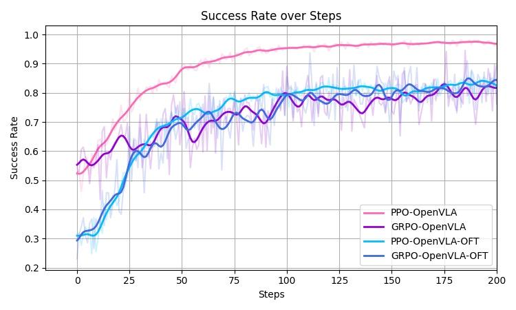 在应用上,与其他框架相比,RLinf 的特色在于Vision-Language-Action Models (VLAs)+RL的支持,为研究人员探索VLAs+RL领域提供了良好的基础算法性能及测试平台。RLinf支持了主流的CPU-based和GPU-based 仿真器(具体平台见说明文档),支持了百余类具身智能任务,集成了主流的具身大模型OpenVLA、OpenVLA-OFT、Pi 0。特别地,团队率先实现了对Pi 0的大规模强化学习微调,相关算法及论文将在9月底发布。在量化指标上,以Maniskill3(典型的GPU-based Simulator )为例进行测试,RLinf采用混合式结合细粒度流水的执行模式。相比其他框架的分离式执行模式,系统效率显著提速120%以上(图7)。OpenVLA及OpenVLA-OFT在Maniskill3 自建25个任务[1]中采用PPO算法和适配具身的GRPO算法训练后,成功率曲线如图8所示,可以看到模型成功率可以从SFT后的30%-50%提升至80%-90%,涨幅40%-50%以上。在公开测试平台LIBERO的4个场景中,OpenVLA-OFT采用RLinf适配具身的GRPO算法训练后,平均成功率达到97.3%,相比SFT模型涨幅62.4%。团队前序工作曾探讨RL和SFT对VLA泛化性提升的不同之处[1],RLinf将研究进一步拓展至大规模场景下,助力探索具身智能领域的RL Scaling Law。相关模型已开源在https://huggingface.co/RLinf,欢迎下载测试。