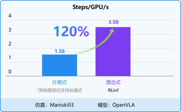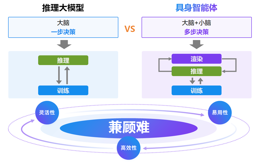 然而,当前框架对具身智能的支持仍然受限。相比推理大模型这一类纯大脑模型,具身智能领域存在大脑(侧重推理、长程规划,如RoboBrain)、小脑(侧重执行、短程操作,如OpenVLA)及大小脑联合(快慢系统,如pi 0.5)等多样模型。其次,**具身智能除了包含Agentic AI的多步决策属性外,他还有一个独特属性:渲训推一体化。**与工具调用智能体、浏览器智能体所交互的仿真器相比,具身仿真器通常需要高效并行物理仿真和3D图形渲染等,因此当前主流仿真器通常采用GPU加速,耦合多步决策带来了算力和显存竞争的新挑战。总的来说,具身智能领域不仅继承了推理大模型和数字智能体的难点,同时还引入了新的渲训推一体化特征,再加上具身智能模型尚未收敛,对框架的灵活性、高效性和易用性提出挑战。