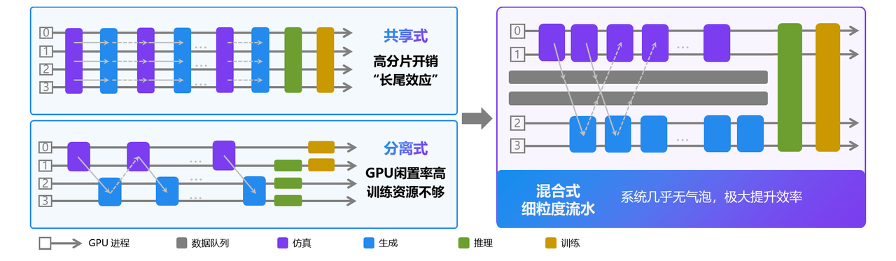 - **混合式(Hybrid Mode):**进一步扩展了灵活性,支持自定义组合不同的放置形式。典型案例是Generator和GPU-based Simulator执行分离式细粒度流水,二者与Inference和Trainer执行共享式。