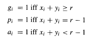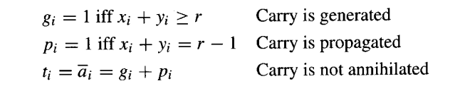 因此,假设上述信号被产生并可用,进位网络设计的其余部分可以基于它们,并且完全独立于操作数甚至数字表示的基数。使用前面的信号,进位递推关系可以写成如下形式: