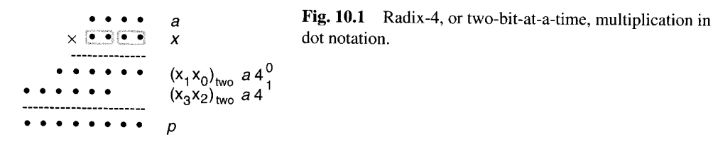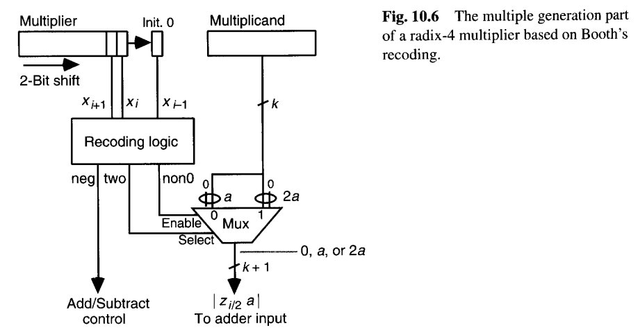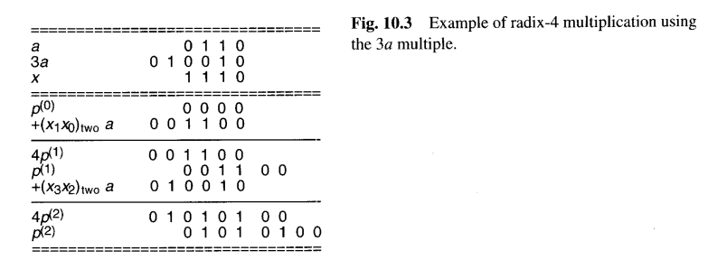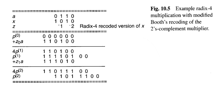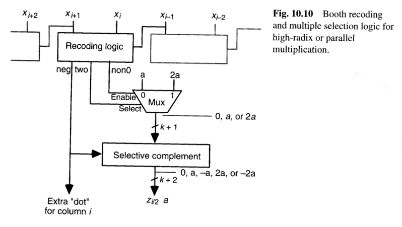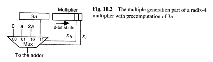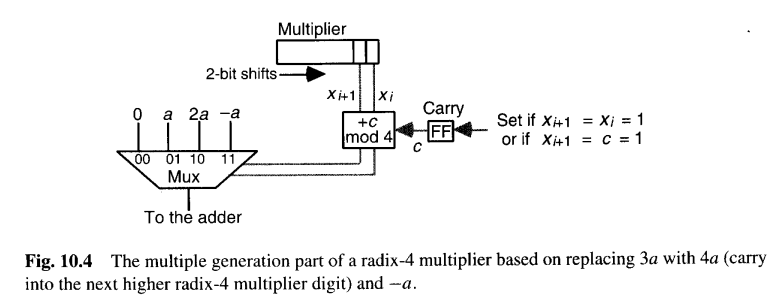 注意,在图10.10的电路中,负倍数−a和−2a是以2的补码格式生成的。通常,这是通过对a或2a进行按位取反并加1完成的。由xi和xi+1产生的倍数a或2a在右侧与位置i对齐,因此当被视为一个2k位数时,必须在其他右侧填充i个零。对这些零进行按位取反,然后在LSB位置加1,会将它们转换回零,并导致一个进位进入位置i。因此,我们可以继续忽略负倍数中的0到i−1位,并直接将额外的"点"插入到位置i。