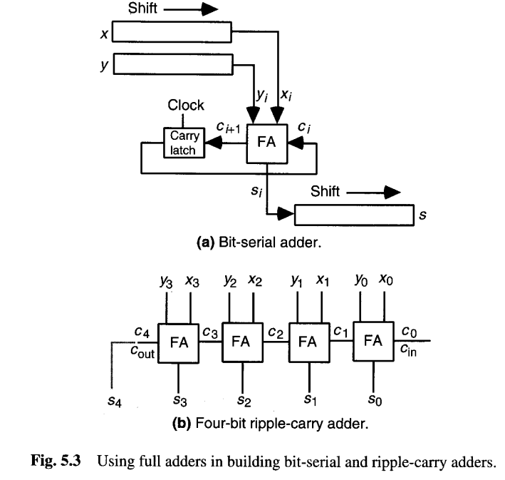 全加器和半加器可用于实现多种算术功能。我们将在本章和后续章节中看到许多例子。例如,一个比特串行加法器 可以由一个全加器和一个进位触发器构建,如图5.3a所示。操作数存储在一对移位寄存器中,从最低有效位开始,每个时钟周期向FA提供一位,而和被移入结果寄存器。因此,k比特数的加法可以在k个时钟周期内完成。一个k比特的行波进位加法器需要k个全加器,其中第i个FA的进位输出连接到第(i+1)个FA的进位输入。得到的k比特加法器产生一个k比特的和输出以及一个进位输出;或者,cout可被视为一个(k+1)比特和的最高有效位。图5.3b显示了一个用于4比特操作数的行波进位加法器,它产生一个4比特或5比特的和。