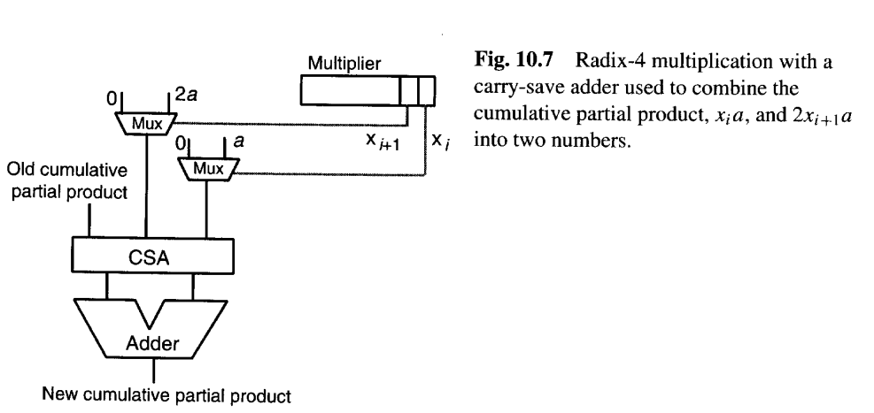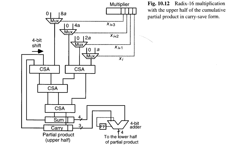 当然,没有迫切的理由要停留在基数16。如果首先应用布斯重编码,可以使用类似图10.12的设计来实现基数256(一次处理8位)的乘法。这将要求将图10.12中的四个多路复用器替换为布斯重编码和选择逻辑。同样,这种新设计是否具有成本效益(例如,与获取乘数的7位并在一个四级CSA树中相加九个数相比)取决于具体技术,无法一概而论。