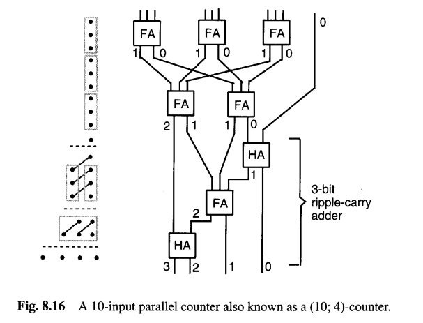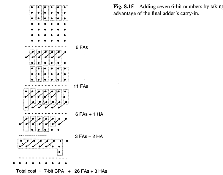 当然,没有强制理由将输入或中间操作数的所有位保持在一起并馈送到多位CSA,这会导致使用许多半加器,这些半加器只是重新排列点而不有助于它们的归约。如图11.2所示,使用单位FA和HA进行归约会导致更低的复杂度,甚至可能更快的速度。推导出执行图11.3电路相同功能的Wallace和Dadda树乘法器留作练习。