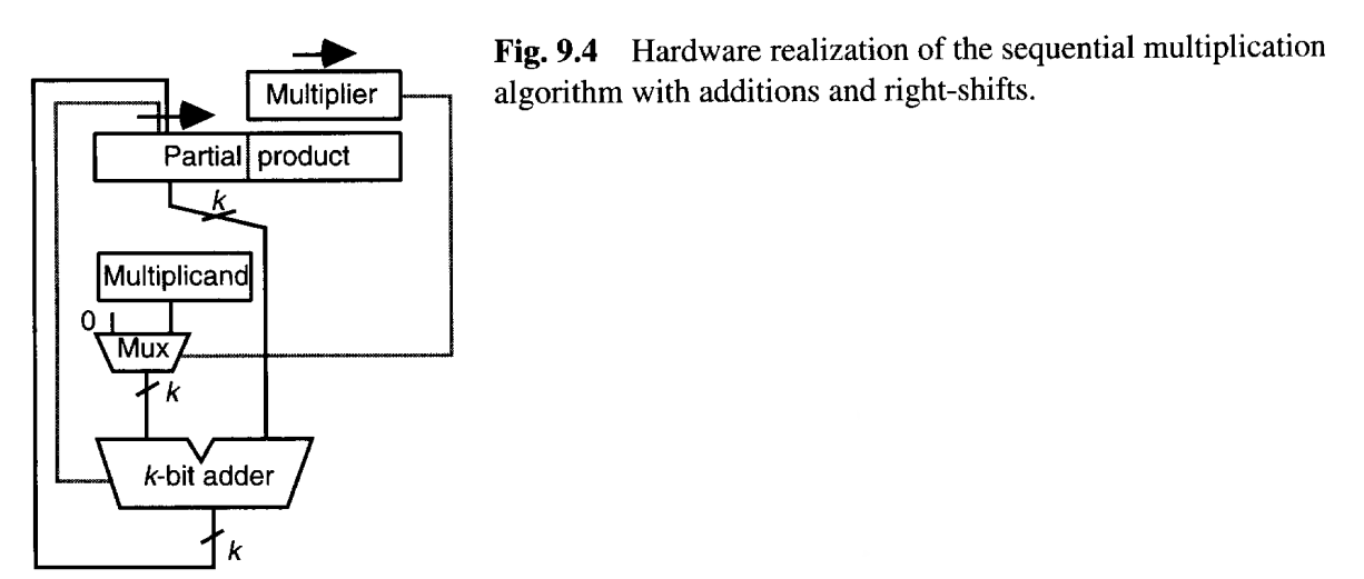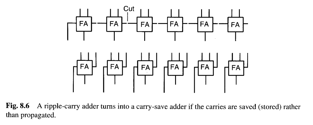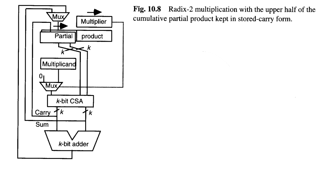 ++现在,前k−1个周期中的每一个都可以变得更短,因为在这些周期中,信号仅通过对应于多路复用器和CSA的几个门级。特别地,这些周期中的延迟与字宽k无关++ 。与简单的顺序乘法器(图9.4)相比,实现图10.8中基于CSA的二进制乘法器所需的额外组件是一个k位寄存器、一个k位CSA和一个k位多路复用器;只有额外的k位寄存器在图10.7的设计中缺失。