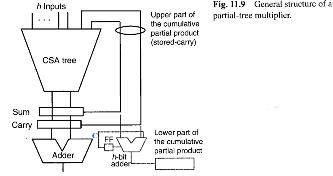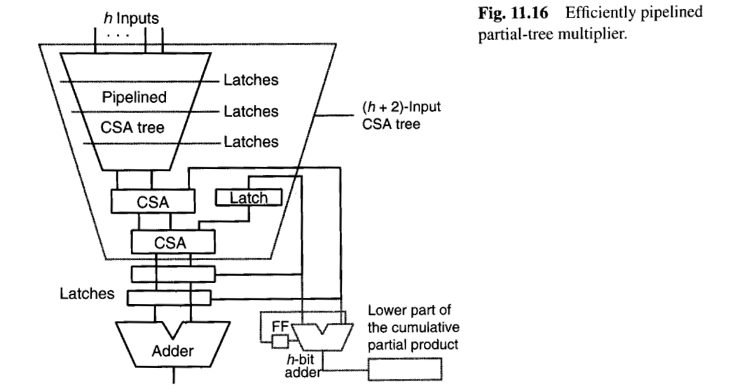 一个完整的树型乘法器可以很容易地实现流水线化。其部分积归约树是一个组合电路,可以被切割成多个流水线级。然而,对于图11.9中的部分树型乘法器,必须等到前一组输入的和与进位被锁存后,才能施加新的输入集。考虑到对于较大的h,树的深度可能相当显著,施加输入到树的速率,从而乘法器的速度,就会受到限制。
