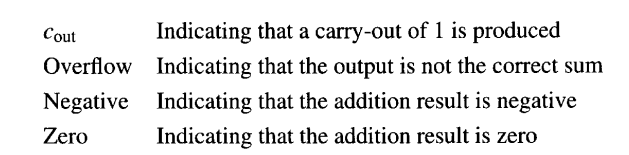 当一个 k 位加法器用于ALU时,通常会提供**k** 位的和以及有关以下结果的信息,这些信息与条件/异常寄存器内的标志位相关联: