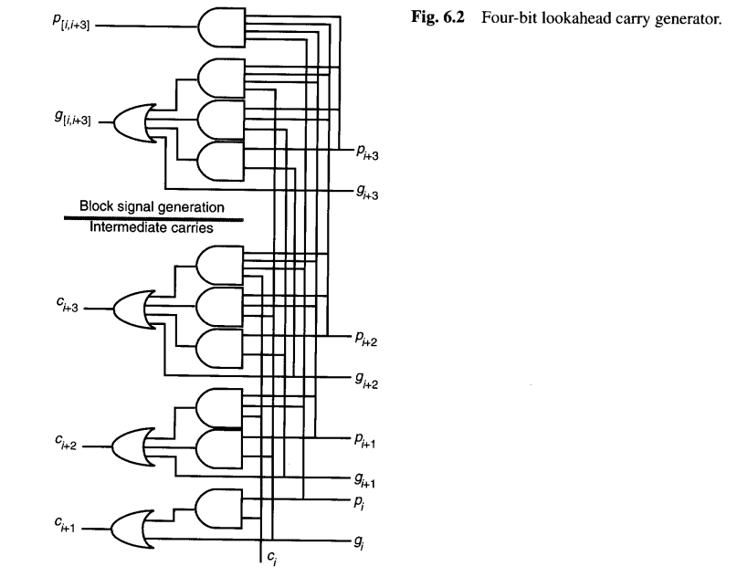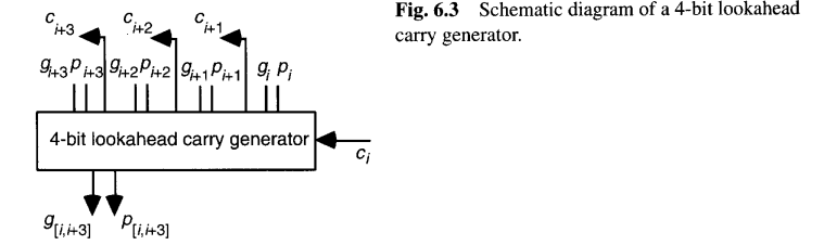 如果我们将图6.1进位网络中标有 c4 的部分替换为能产生块生成和块传播信号 g[i,i+3] 和 p[i,i+3] 的电路,就得到了图6.2的4位超前进位生成器。图6.3以示意图形式展示这个4位超前进位生成器。我们很快将看到,这样的模块可以在多级结构中用于构建任意所需宽度的进位网络。