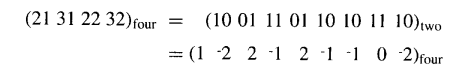 注意,用于二进制操作数的4到2归约电路可以视为一个用于基数为2、数字集为[0,2]的GSD加法器,其中数字用以下2比特编码表示: